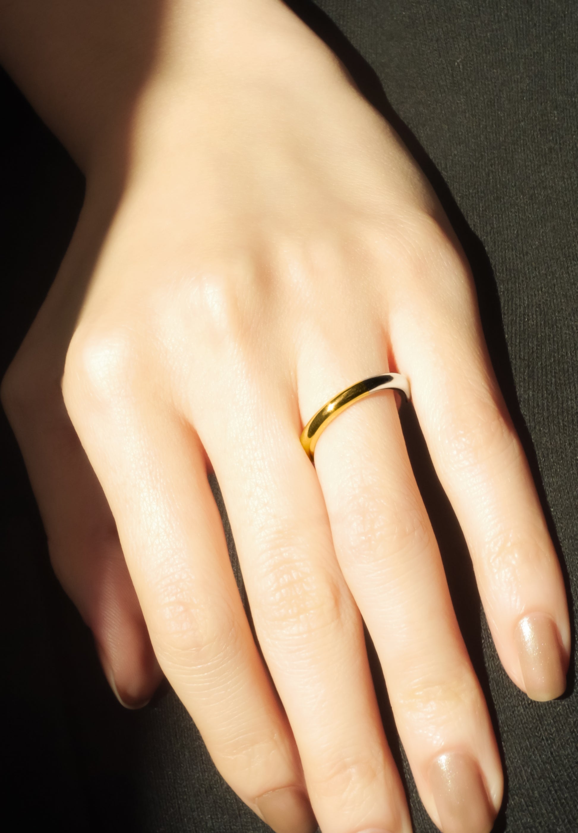 One half of the ring is platinum and the other half is 18k yellow gold. A square silhouette composed of square lines. This ring is often purchased as a pairing, and it has the meaning of sharing half with each other.