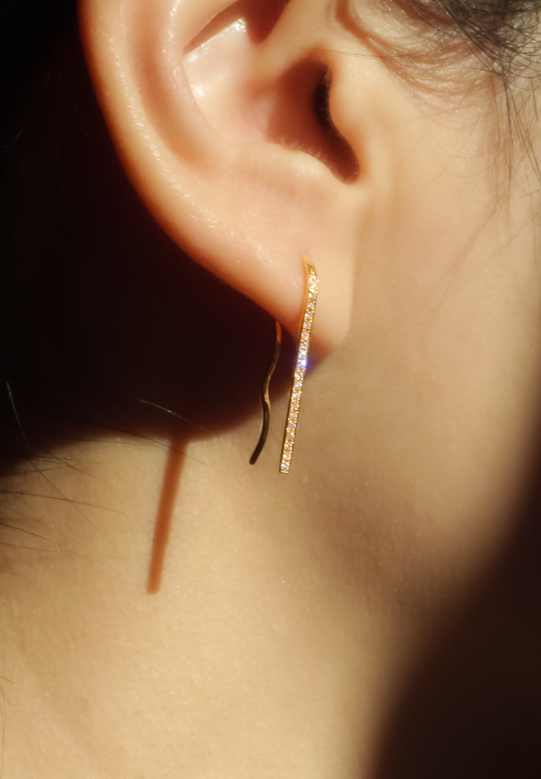 "Swan Lake" earrings are inspired by the ballet "Swan Lake".A version with a tiny diamond placed on the side facing the front when worn.. The shape of these earrings is inspired by hairpins, and is reminiscent of ballerina women and the way they wear hairpins in their hair. The undulating lines create a beautiful line, and when worn on the ear, it becomes an accent with even more presence. The K18 and diamonds give off a luxurious shine that is well-balanced whether you wear it in one ear or both ears.